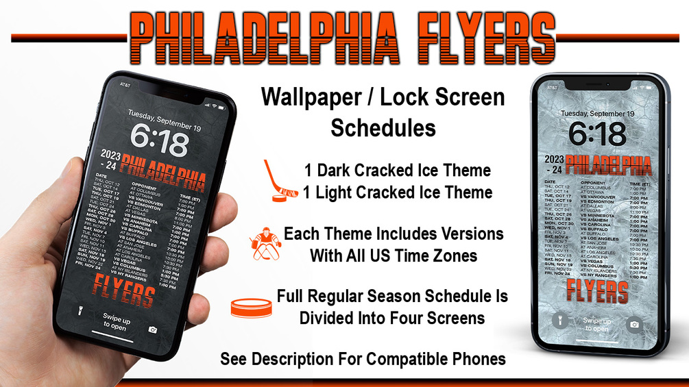 Now you can display the 2023-2024 Philadelphia Flyers schedule right on your iPhone's lock screen or use it as wallpaper. You will receive four Flyers wallpaper dark theme and four light theme lock screen schedules for the 2023-24 regular season. Files are high-resolution .jpg and zipped into one file.