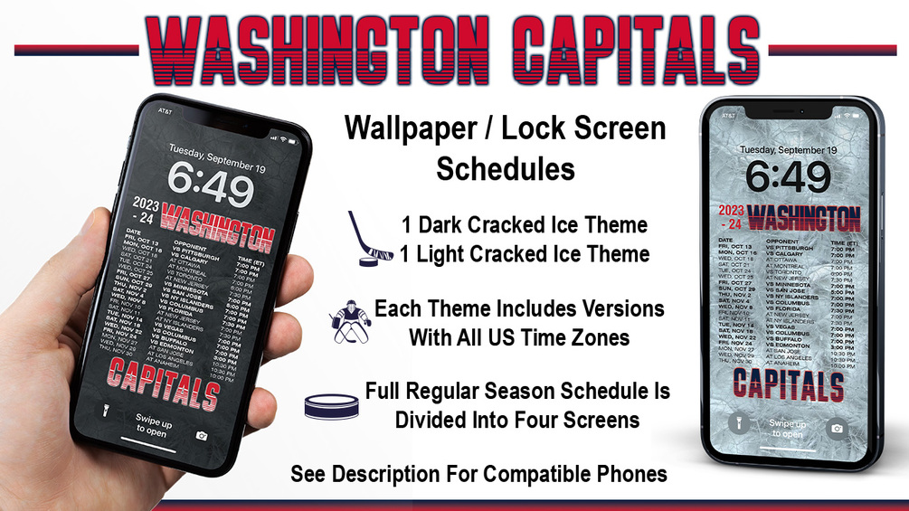 Now you can display the 2023-2024 Washington Capitals schedule right on your iPhone's lock screen or use it as wallpaper. You will receive four Capitals wallpaper dark theme and four light theme lock screen schedules for the 2023-24 regular season. Files are high-resolution .jpg and zipped into one file.