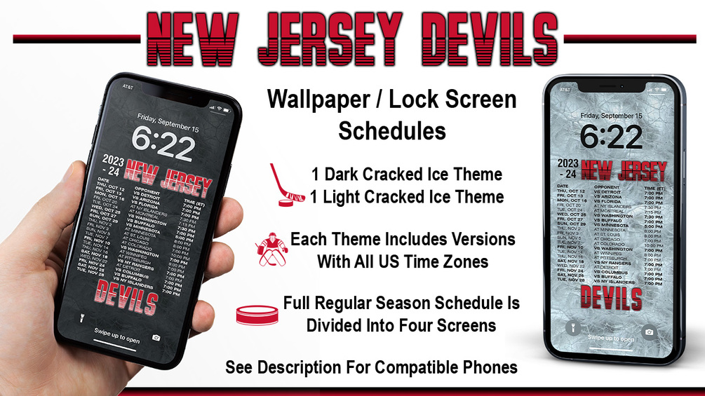 Now you can display the 2023-2024 New Jersey Devils schedule right on your iPhone's lock screen or use it as wallpaper. You will receive four Devils wallpaper dark theme and four light theme lock screen schedules for the 2023-24 regular season. Files are high-resolution .jpg and zipped into one file.