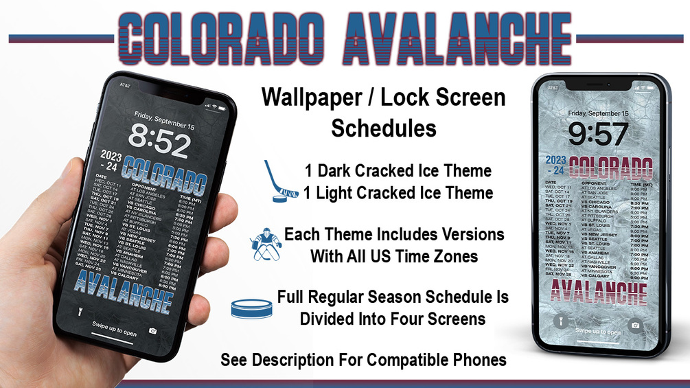 Now you can display the 2023-2024 Colorado Avalanche schedule right on your iPhone's lock screen or use it as wallpaper. You will receive four Avalanche wallpaper dark theme and four light theme lock screen schedules for the 2023-24 regular season. Files are high-resolution .jpg and zipped into one file.