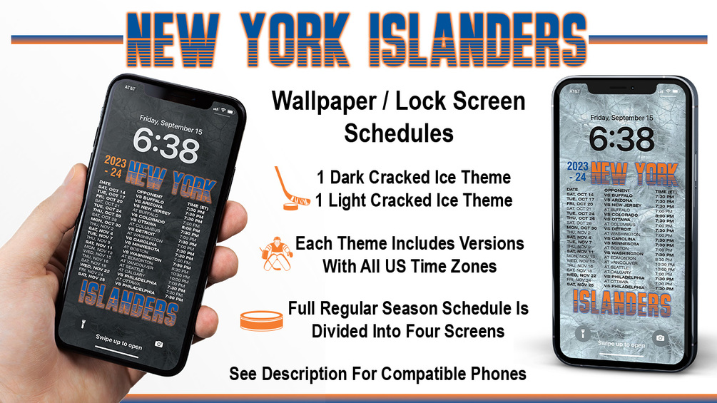 Now you can display the 2023-2024 New York Islanders schedule right on your iPhone's lock screen or use it as wallpaper. You will receive four Islanders wallpaper dark theme and four light theme lock screen schedules for the 2023-24 regular season. Files are high-resolution .jpg and zipped into one file.