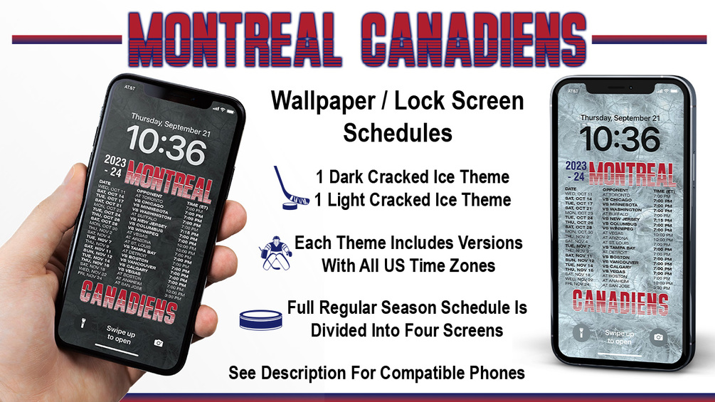 Now you can display the 2023-2024 Montreal Canadiens schedule right on your iPhone's lock screen or use it as wallpaper. You will receive four Canadiens wallpaper dark theme and four light theme lock screen schedules for the 2023-24 regular season. Files are high-resolution .jpg and zipped into one file.