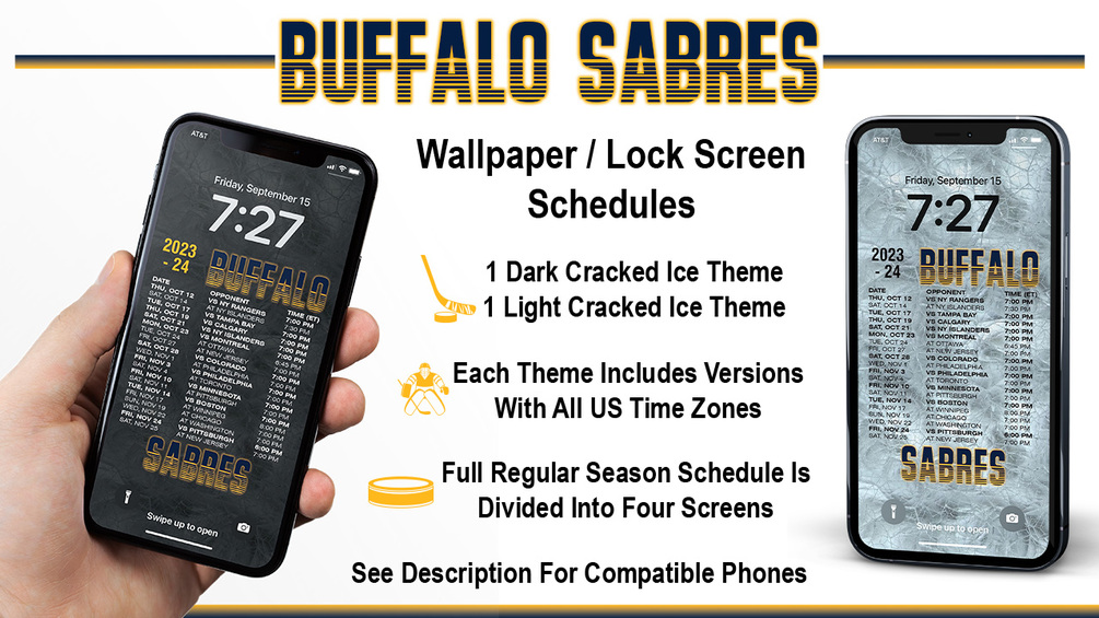 Now you can display the 2023-2024 Buffalo Sabres schedule right on your iPhone's lock screen or use it as wallpaper. You will receive four Sabres wallpaper dark theme and four light theme lock screen schedules for the 2023-24 regular season. Files are high-resolution .jpg and zipped into one file.