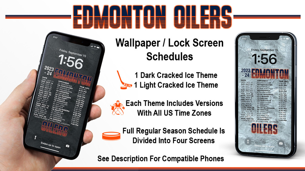 Now you can display the 2023-2024 Edmonton Oilers schedule right on your iPhone's lock screen or use it as wallpaper. You will receive four Oilers wallpaper dark theme and four light theme lock screen schedules for the 2023-24 regular season. Files are high-resolution .jpg and zipped into one file.