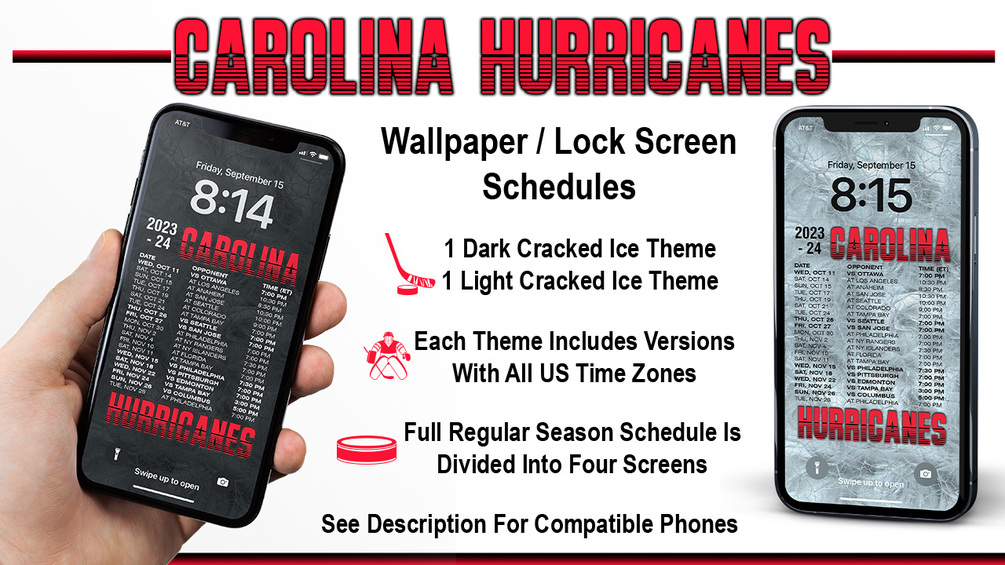 Now you can display the 2023-2024 Carolina Hurricanes schedule right on your iPhone's lock screen or use it as wallpaper. You will receive four Hurricanes wallpaper dark theme and four light theme lock screen schedules for the 2023-24 regular season. Files are high-resolution .jpg and zipped into one file.
